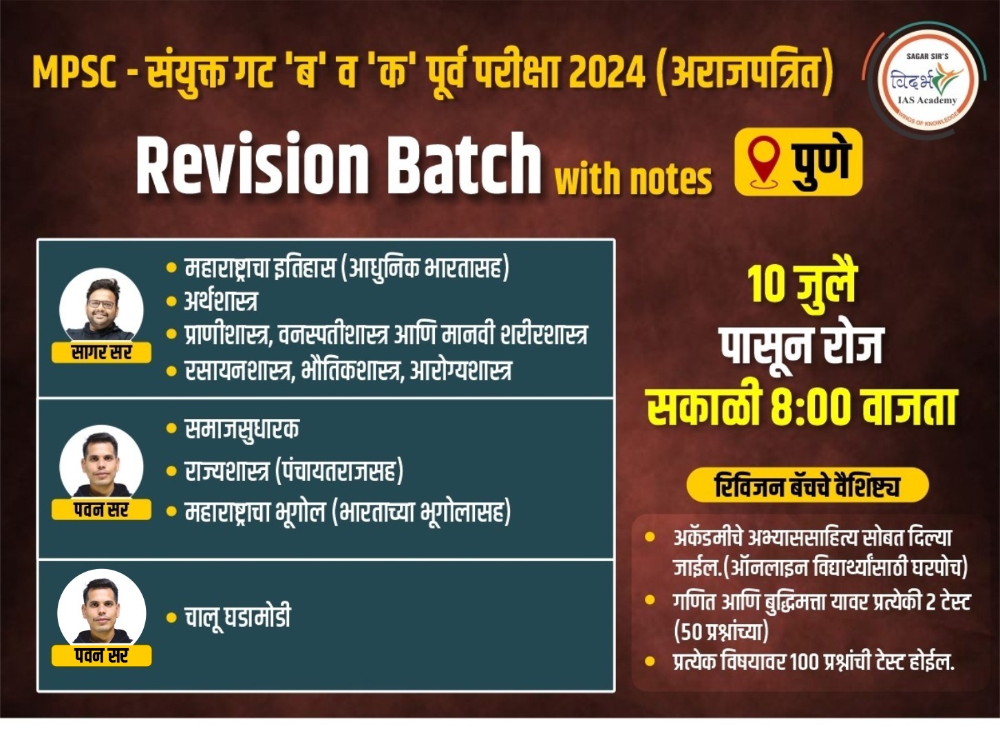 MPSC- RIVISION BATCH - संयुक्त गट ब व क (अराजपत्रित) पूर्व परीक्षा - 2024 01) MPSC- संबंधित बॅचमध्ये विदर्भ आयएएस चे अनुभवी आणि तज्ञ शिक्षक मार्गदर्शन करतील. 02) शिकवणी बरोबर डाऊट क्लिअरिंग सेशन आणि पीवायक्यू सॉल्विंग अप्रोच सुद्धा कव्हर केल्या जाईल. 03) 35 दिवसात संपूर्ण अभ्यासक्रम पूर्व परीक्षेच्या दृष्टीने कट टू कट शिकविल्या जाईल. 04) कन्सेप्ट क्लियरिंग आणि मेकिंग वर आणि पाठांतराच्या ट्रिक्स द्वारे शिकवण्यावर मुख्यतः भर. 05) ऑनलाइन आणि ऑफलाईन अशा दोन्ही प्रकारे हायब्रीड मोडमध्ये बॅच असेल. 06) गणित आणि बुद्धिमत्ता यावर प्रत्येकी 2 टेस्ट (50 प्रश्नांच्या) 07) अकॅडमीचे अभ्याससाहित्य सोबत दिल्या जाईल. (ऑनलाइन विद्यार्थ्यांसाठी घरपोच) 08) प्रत्येक विषयावर 100 प्रश्नांची टेस्ट होईल.MPSC- RIVISION BATCH - संयुक्त गट ब व क (अराजपत्रित) पूर्व परीक्षा - 2024 09) शिकवणी व मार्गदर्शन परीक्षाभिमुख असेल 10) बॅच चा कालावधी कंबाइन पूर्व परीक्षा होई पर्यंत असेल . 11) डाउनलोड करण्यासाठी संपूर्ण पेपर्स chat group मध्ये दिलेले असतील त्याची तुम्ही प्रिंट काढू शकता. 12) एकदा रजिस्टर केलेला मोबाइल नंबर बदलता येणार नाही . 13) FEES NON-REFUNDABLE 14) लॅपटॉप वर बघू शकता. संपर्क :-8668920552 / 9067580048 /8530370674