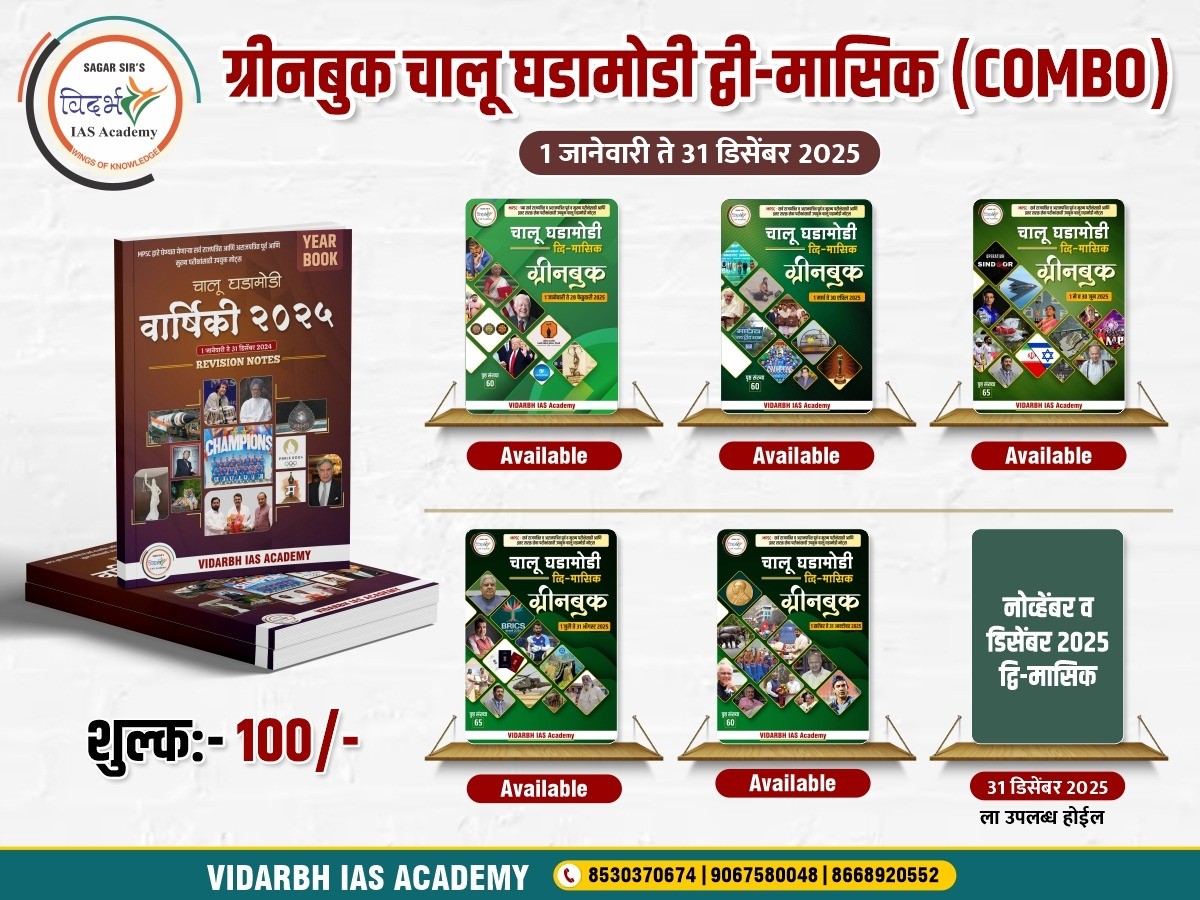1) या कोर्समध्ये 1 जानेवारी ते 31 डिसेंबर 2025 पर्यंतचे चालू घडामोडी द्वि-मासिक PDF स्वरूपात उपलब्ध असतील. 2) सर्व PDF डाऊनलोड करून त्याची झेरॉक्स काढता येईल. 3) सोबतच "वार्षिकी 2025" (1 जानेवारी ते 31 डिसेंबर 2024) याच शुल्कामध्ये उपलब्ध करून दिली आहे. 5) कोर्सचा कालावधी:- 31 डिसेंबर 2026