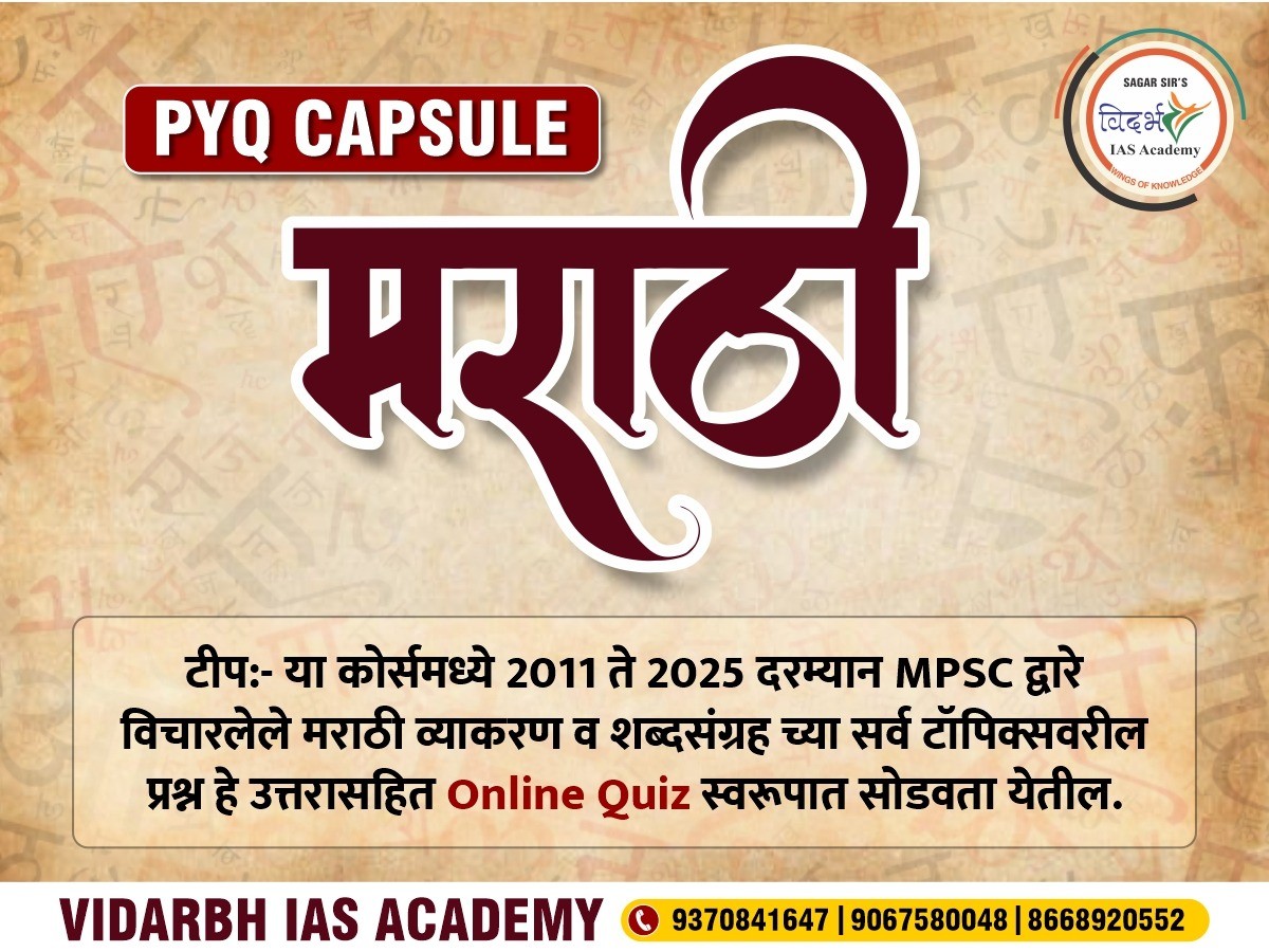 1) विषय:- मराठी व्याकरण व शब्दसंग्रह 2) या कोर्समध्ये MPSC द्वारे आयोजित सर्व परीक्षांसाठीचे 2011 ते 2025 पर्यंतचे PYQ's कव्हर केले आहे. 3) या कोर्समध्ये PYQ हे Online Quiz स्वरूपात सोडवता येतील. 5) 31 डिसेंबर 2025 पर्यंत 'मराठी व्याकरण व शब्दसंग्रह' या विषयाचे सर्व टॉपिक Quiz स्वरूपात उपलब्ध होतील. 6) विद्यार्थ्यांचा चालता बोलता PYQ चा अभ्यास व्हावा यासाठी हा उपक्रम आहे. 7) एकदा रजिस्टर केलेला मोबाईल नंबर बदलता येणार नाही. 8) Fees Non Refundable संपर्क - 8668920552/9067580048/9370841647