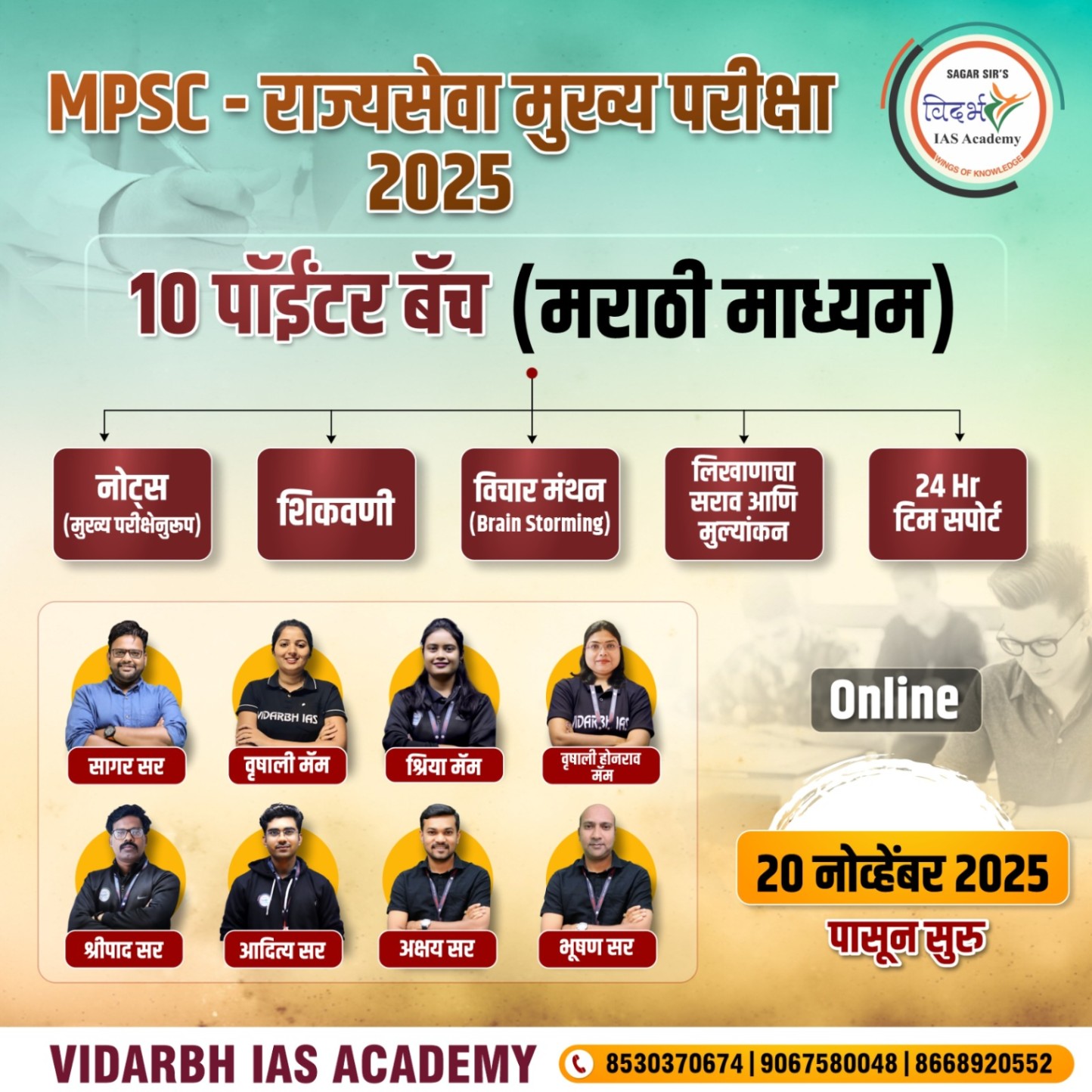 📘 10 POINTER – Online Batch (संपूर्ण मुख्य परीक्षा तयारी) 🚀 सुरुवात – 20 नोव्हेंबर 2025 पासून --- 🌟 बॅचची वैशिष्ट्ये: 1- 4 सामान्य अध्ययनाचे पेपर आणि निबंध लेखनाची परिपूर्ण तयारी. 2- प्रत्येक विषयातील प्रत्येक टॉपिक व सब-टॉपिकवर 10 पॉईंट नोट्स व शिकवणी. 3- उत्तरलिखाण करताना वैचारिक क्षमता विकसित करून परीक्षाभिमुख मांडणीचे मार्गदर्शन. 4- दररोज उत्तरलिखाणाचा सराव व मूल्यमापनासह वैयक्तिक मार्गदर्शन. 5- वक्तशीर आणि शिस्तबद्ध उत्तर तपासणी. 6- त्या त्या विषयातील तज्ञांकडून वैयक्तिक मार्गदर्शन. 7- मार्क्स वाढवण्यासाठी खास Tips & Tricks. 8- Doubt clarification साठी Live Session 9- बॅच मधील विद्यार्थांना GS-1,GS-2,GS-3,GS-4,-च्या नोट्स (10 -पॉईंटर स्वरूपात ) घरपोच येतील... 10- FEES NON- REFUNDABL संपर्क :-अमरावती - 8530370674, 9067580048, 8668920552.