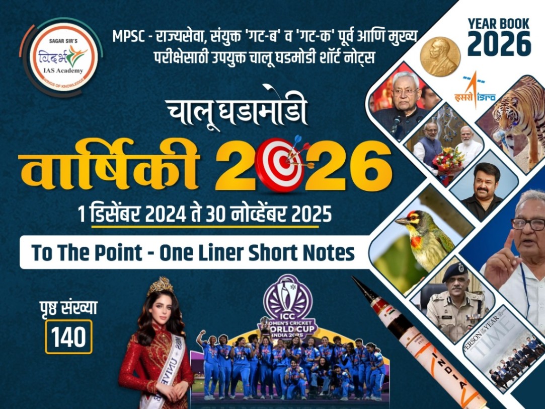 शॉर्ट नोट्स - वार्षिकी 2026 (E-Notes) 1) 1 डिसेंबर 2024 ते 30 नोव्हेंबर 2025 पर्यंतच्या चालू घडामोडींचा समावेश 2) कोर्स मधील Pdf एकूण 140 पेजेसची आहे 3) Pdf डाऊनलोड करून झेरॉक्स काढता येईल 5) जास्तीत जास्त चार्टस चा वापर 6) To The Point मांडणी 7) 1500 पेक्षा जास्त वन लाइनर घडामोडींचा समावेश 8) कोर्सचा कालावधी - 1वर्ष संपर्क - 9067580048 / 9370841647 / 8530370674