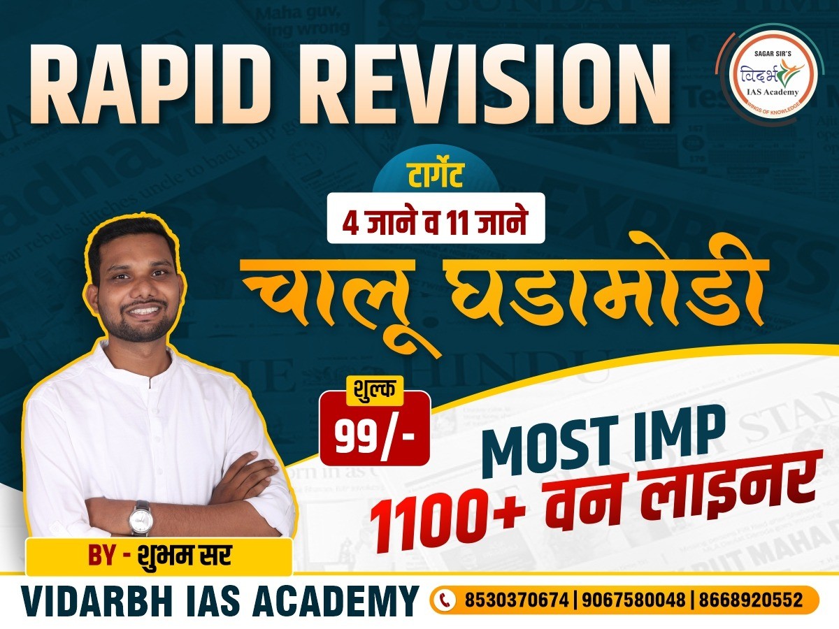 1) या कोर्स मध्ये चालू घडामोडी या विषयातील सर्व टॉपिक्स वरील Most imp Predictable 1100+ वन लाइनर घडामोडींचा समावेश करण्यात आला आहे. 2) या मध्ये उपलब्ध असलेल्या Pdf मोबाईल मध्ये डाउनलोड करता येईल परंतु त्याला पासवर्ड असेल. 3) या Pdf च्या पासवर्ड सरांनी व्हिडिओमध्ये सांगितला आहे. तो पासवर्ड टाकून तुम्ही त्या पीडीएफ उघडू शकता. 4) FEES NON- REFUNDABLE 5) कोर्सचा कालावधी - 02 महिना संपर्क - 9067580048 / 9370841647 / 8530370674