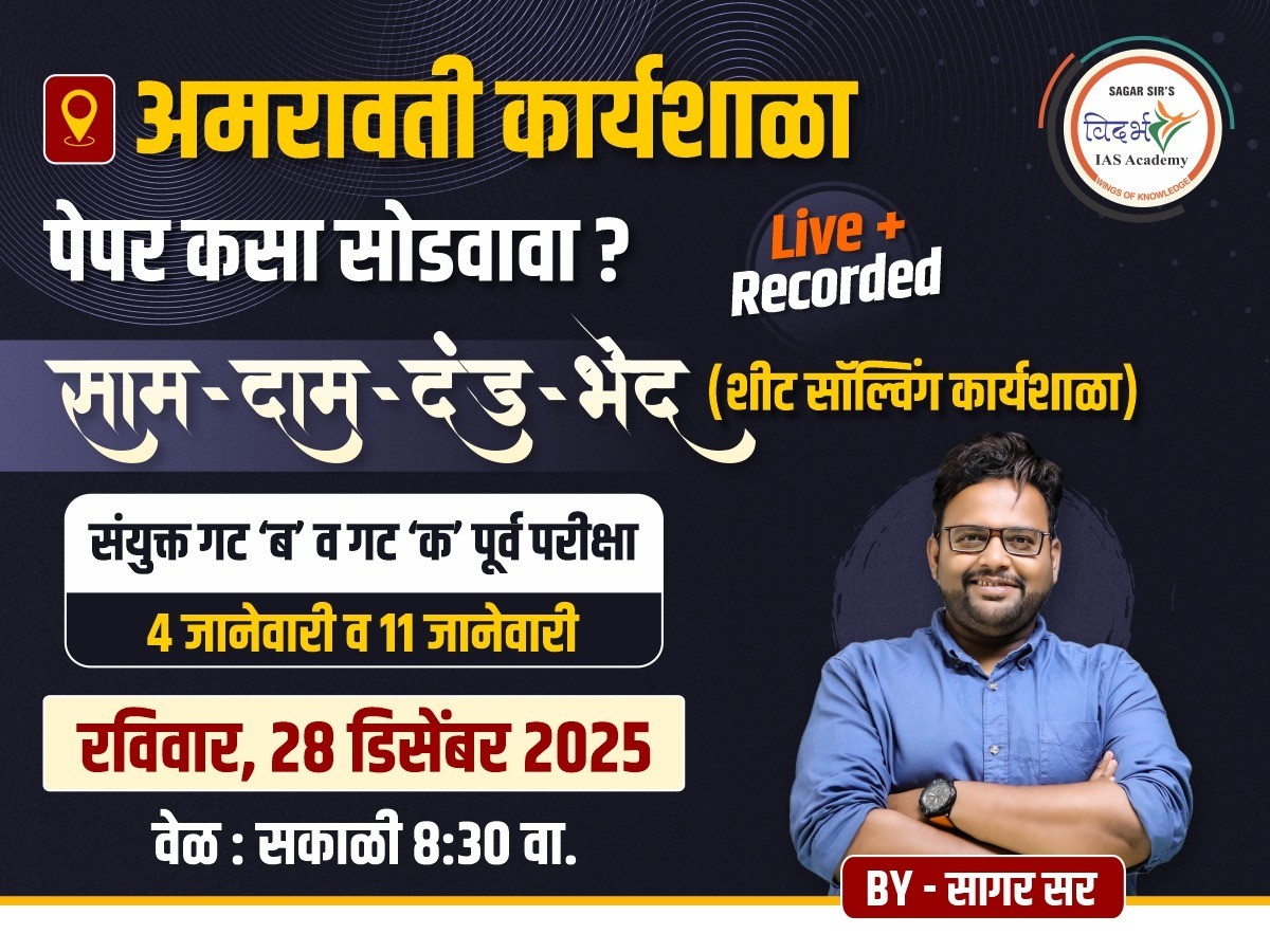 आगामी संयुक्त गट ब व गट क परीक्षेसाठी अत्यंत उपयुक्त 📝 . साम-दाम-दंड-भेद 🎯 (शीट सॉल्विंग कार्यशाळा) . विद्यार्थ्यांच्या मागणीत्सव पहिल्यांदाच ऑनलाईन 📲 BY SAGAR SIR ✨ . कार्यशाळा विदर्भ IAS अकॅडमीच्या ॲप्लिकेशन वर LIVE तसेच RECORDED स्वरूपात उपलब्ध असेल.. . कार्यशाळेमध्ये काय असेल.? 1. आयोगाप्रमाणे टेस्ट सोडून घेतली जाईल. 2. OUT OF SYLLABUS प्रश्न कसे हाताळावे ते शिकवले जाईल. 3. 2 options मध्ये Confusion 4. Time management वर चर्चा केली जाईल. 5. गोळे कसे भरावे. (सर्व एकदाच की एक-एक) रविवार, 28 डिसेंबर 2025 वेळ: सकाळी 8.30 वाजता . नोट: कार्यशाळेचा कालावधी गट क पूर्व परीक्षेपर्यंत (11 जानेवारी) असेल. सूचना : शनिवारी (27 डिसेंबर )संध्याकाळी 6.00 PM शीट उपलब्ध करून देण्यात येईल. सर्व विद्यार्थ्यांनी संबंधित शीटची प्रिंट सेमिनारपूर्वी काढून ठेवणे अनिवार्य आहे. कृपया याची नोंद घ्यावी. सूचना: ज्या विद्यार्थ्यांनी हा कोर्स घेतला आहे, त्यांनी कृपया खालील सूचनेनुसार साम-दाम-दंड-भेद ही प्रिंट सॉफ्ट कॉपी स्वरूपात डाउनलोड करावी. डाउनलोड केलेली फाईल हार्ड कॉपीमध्ये प्रिंट करून घेणे अनिवार्य आहे. 📍 विदर्भ IAS अकॅडमी प्रिंट डाउनलोड करण्याच्या स्टेप्स: अॅप ओपन करा Store Section च्या बाजूला असलेल्या Chat Section मध्ये जा साम-दाम-दंड-भेद प्रिंट निवडा Download करा कृपया सर्व विद्यार्थ्यांनी वेळेत प्रक्रिया पूर्ण करावी. धन्यवाद.