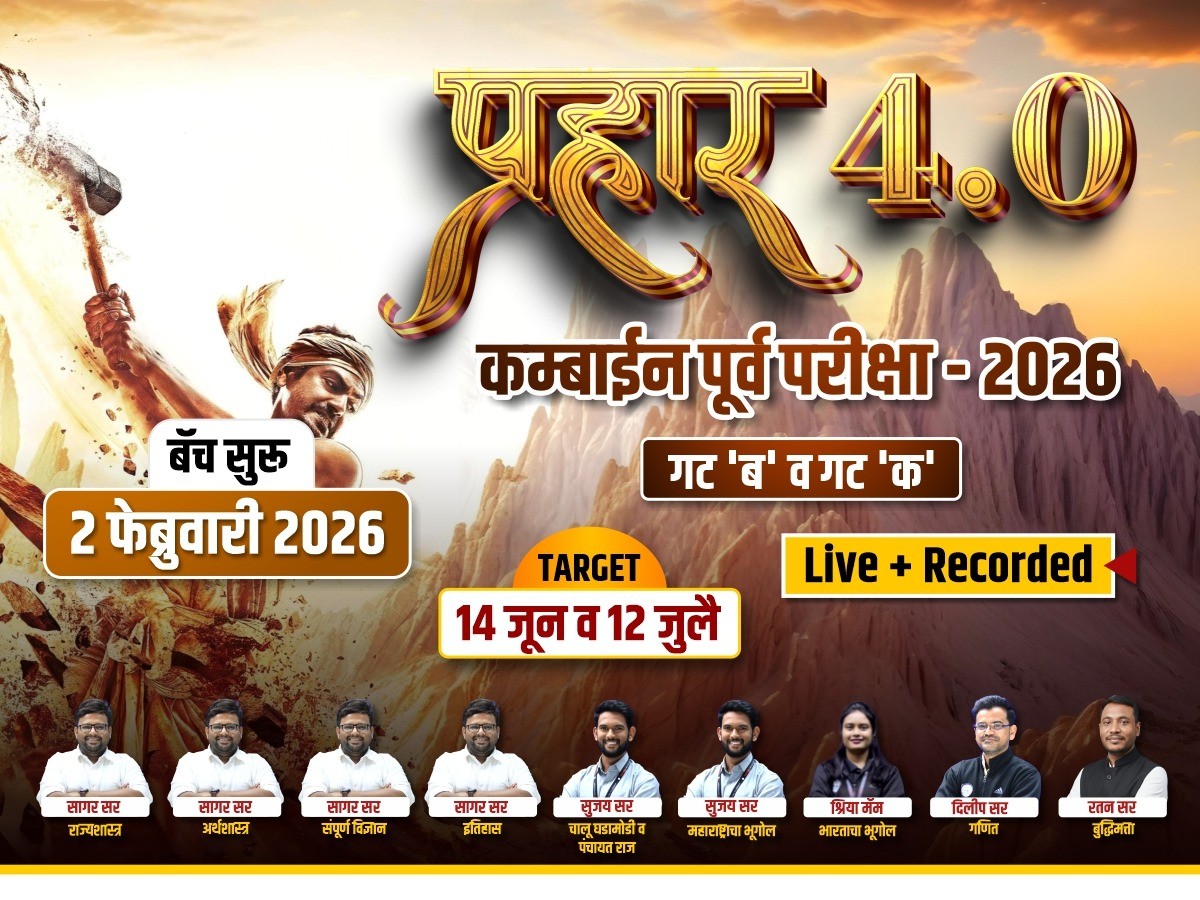 MPSC - महाराष्ट्र अराजपत्रीत गट 'ब' व 'क' सेवा पूर्व परीक्षा 2025-2026 FAST-TRACK (HARD COPY) बॅचची वैशिष्ट्ये. 1) बॅचमधील सर्व लेक्चर्स हे Live+Recorded राहतील. 2)प्रहार-4.0 बॅच 2 फेब्रुवारी 2026 पासून सुरु होणार 3) लेक्चर्स लाईव्ह प्रमाणेच रेकॉर्डेड असल्यामुळे विद्यार्थी आपल्यासोयीने लेक्चर पाहू शकतात. 4) रेकॉर्डेड लेक्चर पाहण्यावर वेळेची तसेच वारंवारतेची मर्यादा नसेल म्हणजेच विद्यार्थी रेकॉर्डेड लेक्चर कितीही वेळा पाहू शकतात. 5) या कोर्स मध्ये घरपोच अभ्यास साहित्य मिळणार नाही याची विध्यार्थानी नोंद घावी . 6) module मध्ये दिल्याप्रमाणे दिलेल्या तारखेला व ठरलेल्या शिक्षकामार्फत लेक्चर्स होतील. 7) कालावधी कंबाइन पूर्व परीक्षा होई पर्यंत असेल . 8) FEES NON-REFUNDABLE. संपर्क :- 8530370674 / 8668920552 / 9067580048