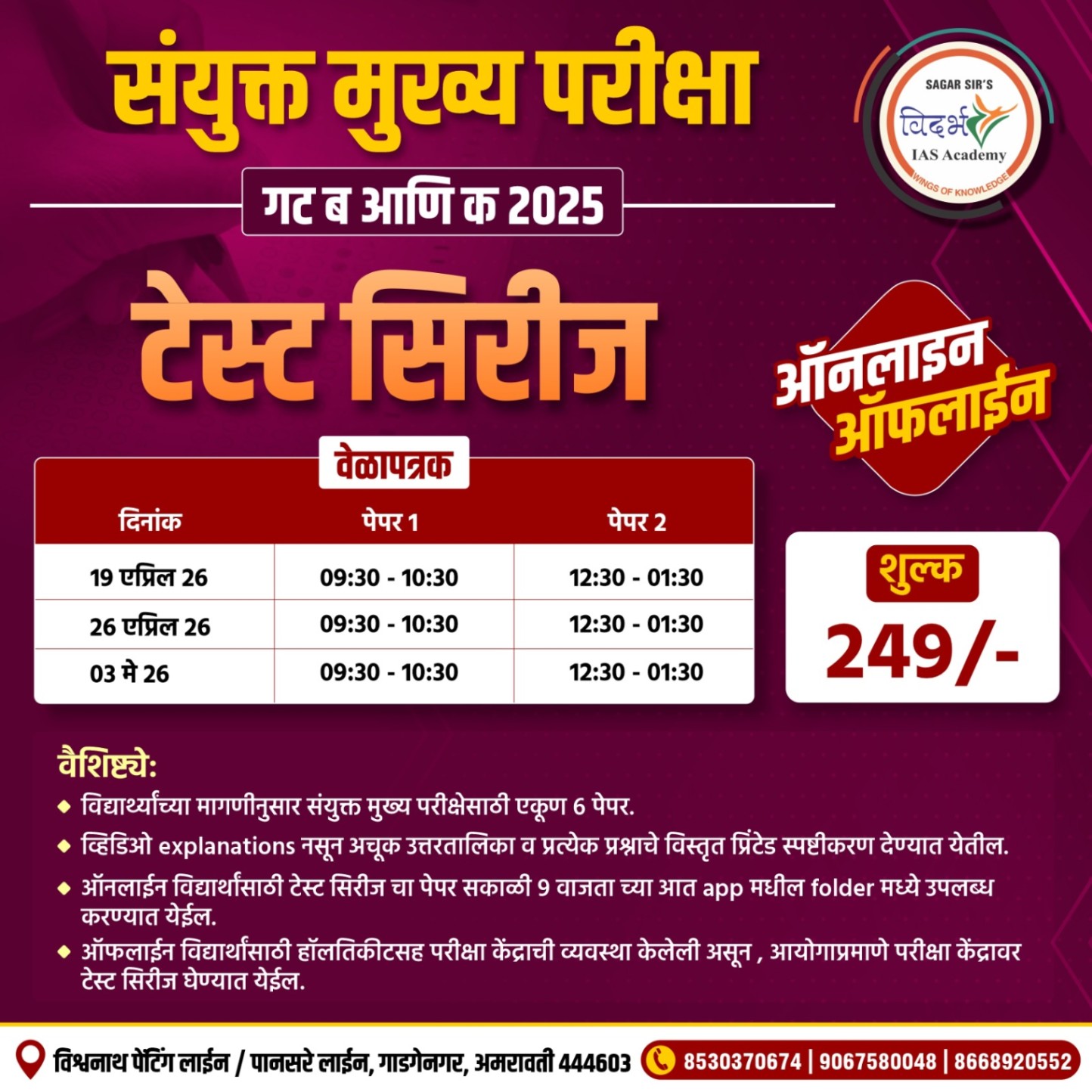 महाराष्ट्र अराजपत्रीत सेवा संयुक्त मुख्य परीक्षा (गट 'ब' व गट 'क') 2026 (WITH DETAILED EXPLANATION) एकुण - 03 टेस्ट **वैशिष्ट्ये:** 1)विद्यार्थ्यांच्या मागणीनुसार संयुक्त मुख्य परीक्षासाठी एकूण 6 पेपर. 2) व्हिडिओ explanations नसून अचूक उत्तरतालिका व प्रत्येक प्रश्नाचे विस्तृत प्रिंटेड स्पष्टीकरण देण्यात येतील. 3)ऑनलाइन विद्यार्थ्यांसाठी टेस्ट सिरीज चा पेपर सकाळी 9 वाजता च्या आत app मधील folder मध्ये उपलब्ध करण्यात येईल. 4)ऑफलाइन विद्यार्थ्यांसाठी हॉलतिकिटसह परीक्षा केंद्राची व्यवस्था केलेली असून, आयोगाप्रमाणे परीक्षा केंद्रावर टेस्ट सिरीज घेण्यात येईल. 5)FEES NON-REFUNDABLE 6)ऑफलाईन फीस 300 रुपये असेल. संपर्क :- अमरावती - 8668920552 / 9067580048 / 8421960691